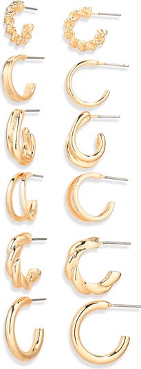 This set of twist hoop earrings includes six pairs finished in 14k gold plate, offering versatile shine for everyday and dressed-up looks alike.