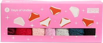 Perfect for holiday gifting, this colorful assortment of lace hipster briefs comes in a pack of seven to help you count down to Christmas.