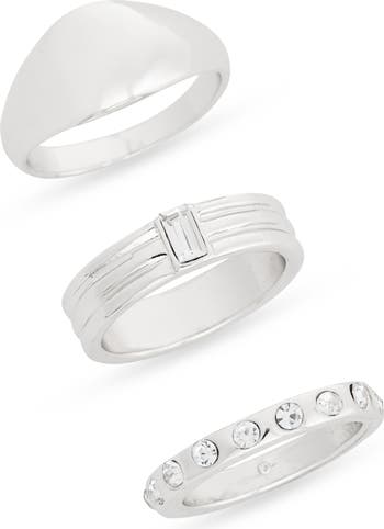 An assortment of crystals bring lustrous sparkle to this set of three rings made with polished plating.