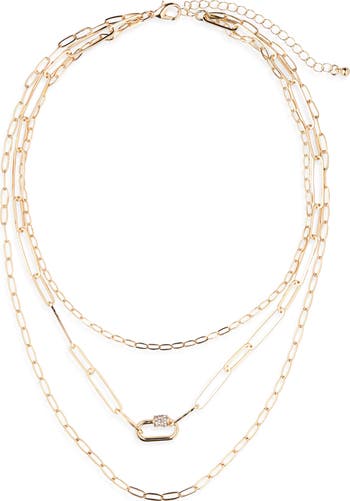 Pavé cubic zirconia illuminate a caribiner pendant of a gleaming oval-link chain necklace in a multi-layered silhouette.