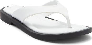 A contrast midsole and squared silhouette update the look of a flat sandal secured with a traditional post toe.