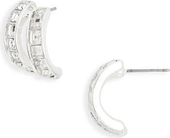 Square crystals bring glamorous sparkle to these dainty double huggie-hoop earrings boasting a high-shine finish.