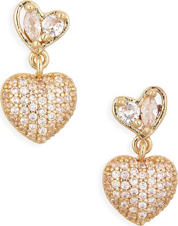 Lustrous open hearts contain a duo of cubic zirconia stones and anchor pavé pendants on these lovely earrings.