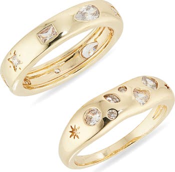 An assortment of cubic zirconia stones sparkle and shine on a set of rings with a gleaming goldtone finish.