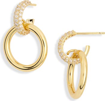 Pavé cubic zirconia sparkle from these elegant huggie-hoop earrings suspending open-circle drops plated in warm 14-karat yellow gold.