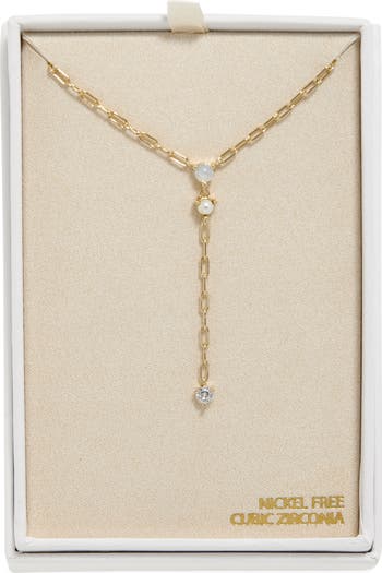 A bezel-set CZ, luminous opal and glossy faux pearl sparkle and shine along the slender paper-clip chain of this delicate Y-necklace.