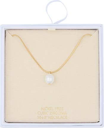 A lustrous faux pearl with an organic shape shimmers on this refined necklace set on a golden snake chain.