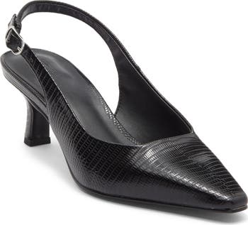 A pointed toe balances the slingback strap of this easy pump lifted by a modest kitten heel.