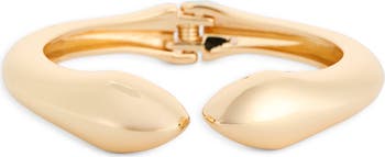 Teardrop-shaped curves define this hinged bracelet offered in polished goldtone plate.