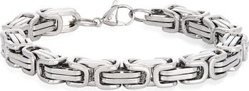 Neatly folded links interlock to create an intricate design on this polished bracelet that offers modern shine.