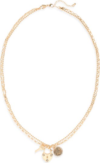 Perfect to layer or wear solo, this polished double-chain necklace suspends sparkly crystal-embellished charms for vintage-inspired shine.