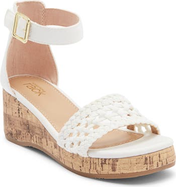 A braided vamp strap in a metallic hue amps up the style points of a wedge sandal that can easily be dressed up for a special occasion.