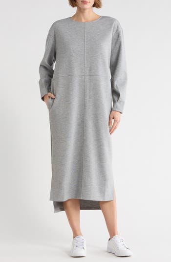 Pintuck pleats and raised seams loosely structure a long-sleeve column dress rendered from a supersoft neoprene fabric and furnished with on-seam pockets for a practical finish.
