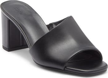 An asymmetric vamp brings modern dimension to this easy-wear slide sandal constructed with an inset elastic gore and a bold block heel.