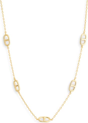 Oval mariner links trim the dainty, delicate chain of a necklace finessed in 14-karat gold for a lasting luster.