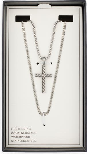 A twisted cross pendant defines this layered box-chain and curb-chain necklace crafted from polished stainless steel.