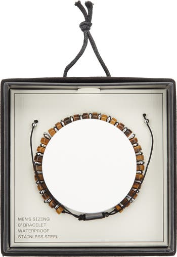Great to layer or wear solo, this adjustable slider bracelet is traced by glossy stainless steel beads and tiger's-eye stones for natural shine.