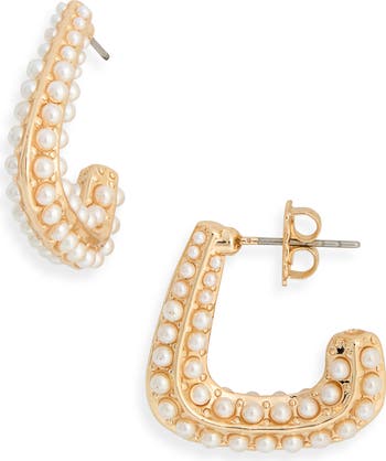 Elevate your daytime or evening ensembles with these J-shaped hoops covered in microfaux pearls.
