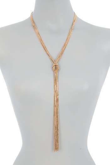 Multiple strands of gold-tone or silver-tone chains knot at the center to create an attention grabbing necklace with a tassel-like Y-drop. - Gold-tone or silver-tone, multi strand knotted Y-necklace - Lobster clasp - Approx. 21.5" chain length with 2.5" extension - Approx. 9.5" Metal Fringe pendant - Imported