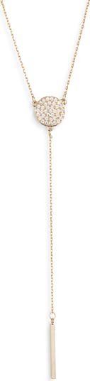 A crystal-studded disc and endcaps add glam sparkle to a slender chain lariat necklace suspending a slender drop pendant.