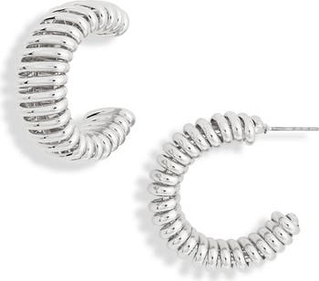 A ribbed texture catches the light on these contemporary hoop earrings boasting a high-shine finish.
