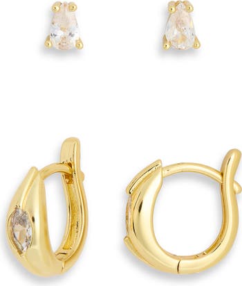 Shine all day with this set of 14-karat gold-layered stud and huggie-hoop earrings illuminated by sparkly cubic zirconia.