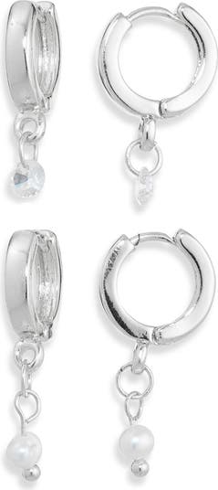 Set of 2 Faux Pearl & Cubic Zirconia Huggie Hoop Earrings