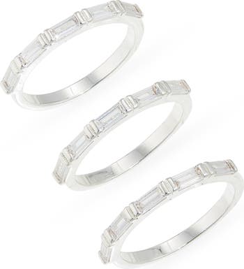 Stack on the sparkle with this set of three slender eternity-band rings illuminated by baguette-cut cubic zirconia.