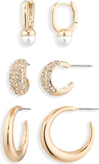 Sparkle and shine with this set of three earrings including faux pearl–embellished huggies, pavé crystal huggie hoops and polished crescent hoop earrings.