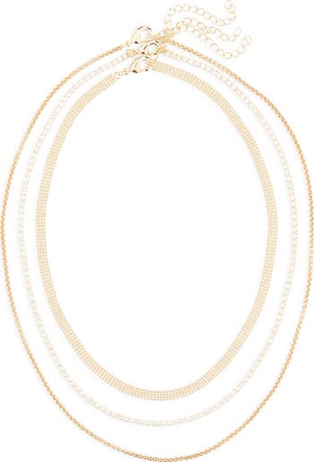 Stack on the shine with this layerable necklace set including a dainty box chain, mesh ball chain and cubic zirconia tennis necklace.