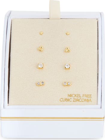 Mix up your look with this set of dainty stud earrings accented by sparkly cubic zirconia and plated in warm 14-karat gold.