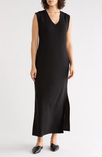 A heavyweight woven fabric delivers a sporty finish and feel to a sleeveless dress featuring a V-neckline and twin splits for extra ease of movement.
