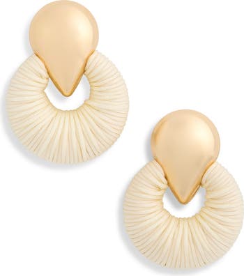 A striking fusion of materials, these gleaming earrings designed in a door knocker silhouette feature thread-wrapped accents and are sure to make a statement.