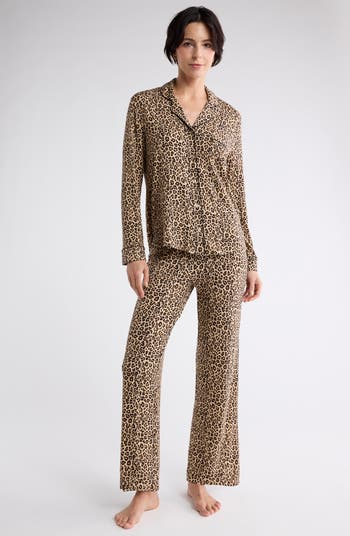Drift off to dreamland in this ultrasoft jersey pajama set that pairs a long-sleeve button-up top with matching drawstring waist-pants.