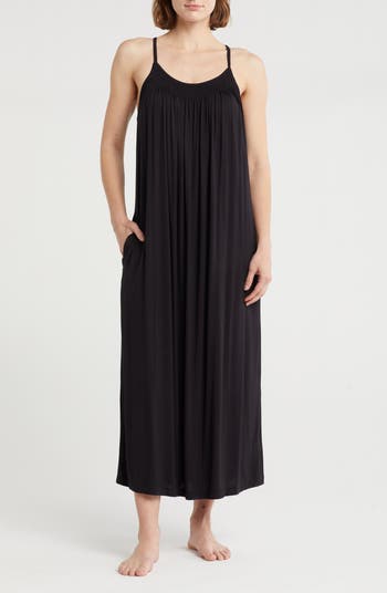 Slip into tranquility wearing this soft nightgown styled with a smocked neckline and handy pockets.