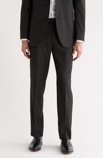 Satin accents bring traditional detailing to the outseams and beltless waistline of tuxedo pants tailored from plus with flat-front construction completing the streamlined, elegant look.