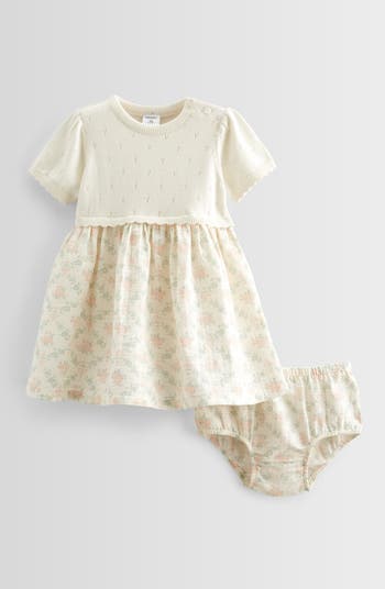 Pointelle stitches give texture to the sweater-inspired bodice of this mixed-media dress that's paired with matching cotton bloomers to complete baby's look.