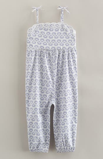 Baby will be ready for sunny days in this woven-cotton romper sweetened with scalloped trim, a smocked back and charming bows at the thin straps.