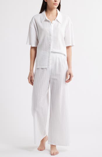 Sleep tight or lounge right—these cozy cotton seersucker pajamas featuring a button-up top and elastic-waist pants are your ultimate stay-in uniform.