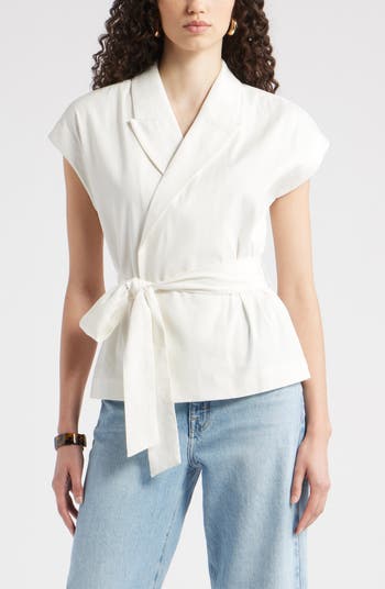 Keep your warm-weather look polished with this belted blazer cut in a sleeveless silhouette with dropped shoulders from a breathable linen blend with a touch of stretch.