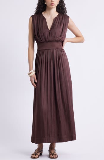 Perfect to dress up or down, this drapey satin maxi dress is framed by a smocked waist and handy side pockets.