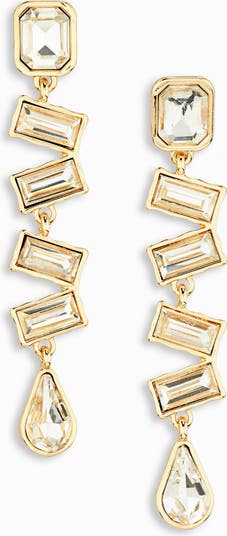 Sparkly crystals change shape as they stagger down linear drop earrings plated in high-shine goldtone.