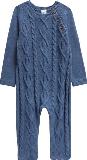 A chunky cable knit signals baby will be supercomfy in this stretchy sweater-romper with buttons at one shoulder for easy on/off.