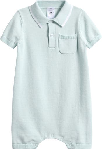 Tipping on the collar gives a preppy look to this polo-style romper knit from soft cotton.