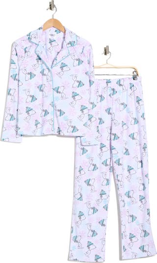 Snoopy, all dressed for the coming cold weather in an adorable striped beanie against a whimsical snowflake background, sets the cozy mood on these too‑cute‑to‑miss pajamas.