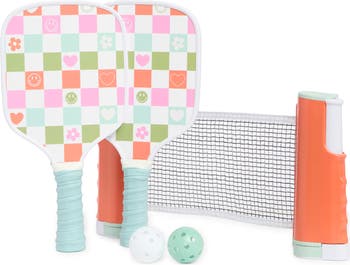 Bring a pickleball game inside your home with this table top game set featuring two paddles, two balls and a net.