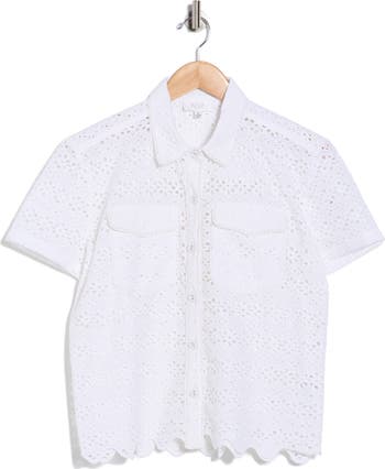Embroidered eyelets neatly punctuate a button-up shirt that's fronted with pockets to combine sweet style with the utilitarian aesthetic.