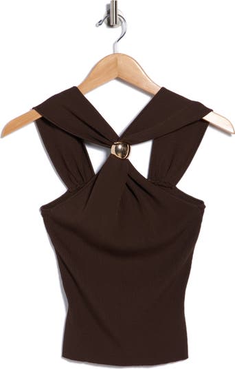 A golden orb accent takes center stage on this sweater tank that features a unique V-neckline.