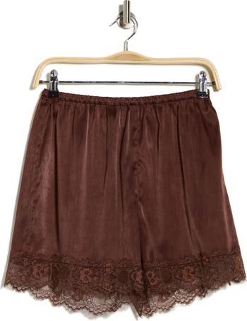 Scalloped lace enhances the romantic style of these lightweight satin shorts framed by a comfortable elastic waist.