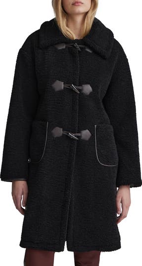 Faux leather toggle closures add a timeless touch to a cozy coat made from fuzzy berber fleece.